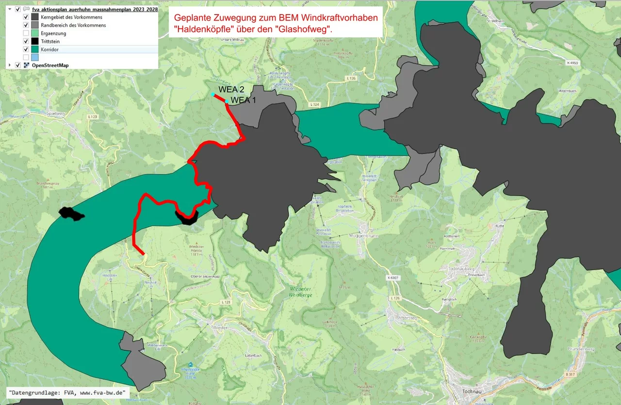 Die Zuwegung sowie die Positionen der Windkraftanlagen wurden von uns ergänzt. Geringe Abweichungen durch die Übertragung sind möglich.